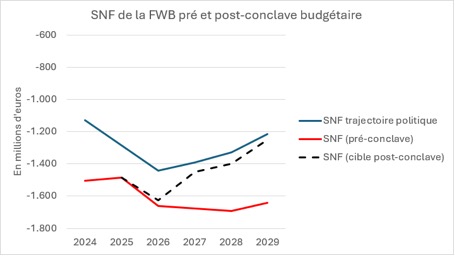 L’augmentation du déficit par rapport à 2025 s’explique par la hausse des charges d’intérêts, l’augmentation de la cotisation de responsabilisation pension de la Loi spéciale de financement, le remboursement de recettes fédérales trop perçues en 2025, la décision de mettre fin au sous-financement structurel de l’ONE et par le fait que les principales mesures d’économies adoptées entreront en vigueur à la rentrée scolaire 2026 et ne feront pleinement sentir leurs effets qu’à partir de 2027.